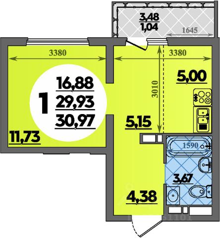 • Санузел под ключ: ванна с декоративным экраном, удобная раковина с пьедесталом, смесители, полотенцесушитель. На полу керамогранит.