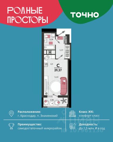 Продается квартира-студия в Жилом комплексе "Родные просторы"! В квартире выполнена качественная предчистовая отделка: Выровненные и подготовленные для отделки финишными материалами стены — улучшенная штукатурка стен. Подготовленный к укладке покрытия пол — стяжка пола. Коммуникации, выведенные в специальных местах в санузлах и кухонной зоне. Металлические входные двери с внутренней фрезеровкой и 2 замками. Металлопластиковые окна с долговечной фурнитурой. Радиаторы со встроенными терморегуляторами. Гидроизоляция пола санузлов. Крутая комплексная застройка территории с развитой инфраструктурой - на территории комплекса расположены школа на 1550 мест, 3 детских сада на 800 мест, поликлиника и частные клиники. На первых этажах домов расположены коммерческие помещения. Дворы свободны от автомобилей. Для автовладельцев предусмотрено более 2000 мест на открытых парковках по периметру микрорайона, и многоуровневые крытые наземные паркинги. Большая часть микрорайона оборудована пешеходными зонами и благоустроенными придомовыми территориями со спортивными площадками и большими детскими игровыми пространствами. Вся инфраструктура района находится в пешей доступности и располагаться внутри микрорайона. Рядом трасса М-4 - удобный выезд в сторону моря! Звоните прямо сейчас и покупайте квартиру в классном жилом комплексе!