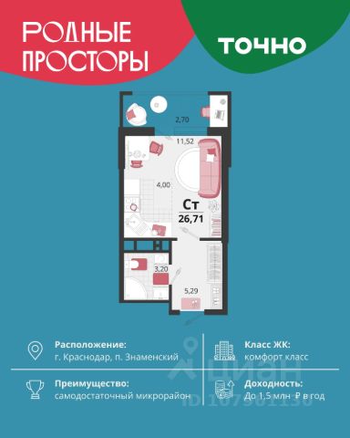 Продается квартира-студия в Жилом комплексе "Родные просторы"! В квартире выполнена качественная предчистовая отделка: Выровненные и подготовленные для отделки финишными материалами стены — улучшенная штукатурка стен. Подготовленный к укладке покрытия пол — стяжка пола. Коммуникации, выведенные в специальных местах в санузлах и кухонной зоне. Металлические входные двери с внутренней фрезеровкой и 2 замками. Металлопластиковые окна с долговечной фурнитурой. Радиаторы со встроенными терморегуляторами. Гидроизоляция пола санузлов. Крутая комплексная застройка территории с развитой инфраструктурой - на территории комплекса расположены школа на 1550 мест, 3 детских сада на 800 мест, поликлиника и частные клиники. На первых этажах домов расположены коммерческие помещения. Дворы свободны от автомобилей. Для автовладельцев предусмотрено более 2000 мест на открытых парковках по периметру микрорайона, и многоуровневые крытые наземные паркинги. Большая часть микрорайона оборудована пешеходными зонами и благоустроенными придомовыми территориями со спортивными площадками и большими детскими игровыми пространствами. Вся инфраструктура района находится в пешей доступности и располагаться внутри микрорайона. Рядом трасса М-4 - удобный выезд в сторону моря! Звоните прямо сейчас и покупайте квартиру в классном жилом комплексе!