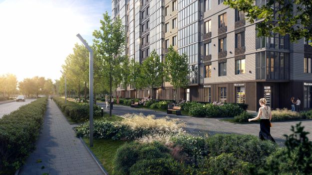 Уютный двор с дизайнерским озеленением, рулонные газоны, клумбы с автополивом, современные детские и спортивные площадки с безопасным покрытием и много свободного пространства благодаря широкой посадке домов.