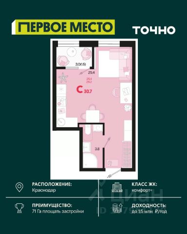 Продаётся студия в сданном доме (Литер 4), срок сдачи: III-кв. 2022, общей площадью 21.54 кв.м., на 13 этаже. Расположение, транспортная доступность