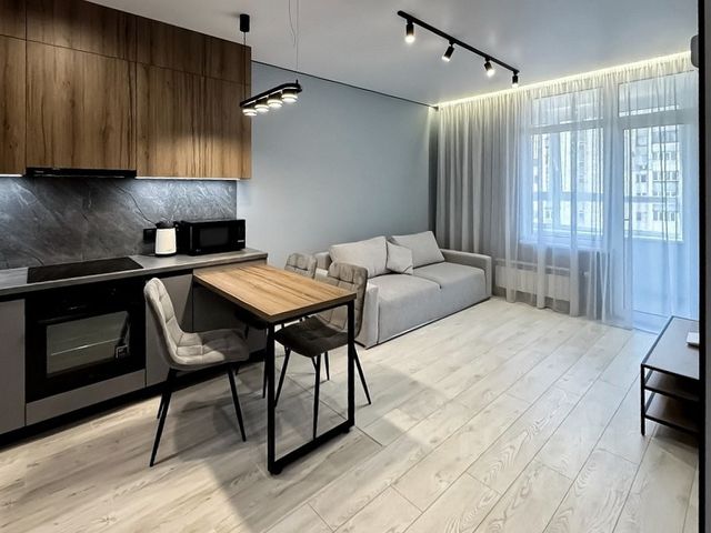 Квартира-студия в динамично развивающимся районе города в ЖК "Дружный". Это готовое решение с ремонтом в стиле лофт, с мебелью и техникой. Все новое, в квартире никто не проживал. Квартира подготовлена к продаже для тех, кто экономит время, не желает заниматься строительными работами и обустройством и ценит комфорт. Мы продумали большое количество мест для хранения, подготовили уютную зону для учёбы или удалённой работы. Современная кухня-ниша изготовнена по индивидуальному проекту со встроенным холодильником, индукционной плитой, вытяжкой, микроволновой печью, а так же дополнительными местами хранения в цоколе. Кухню дополняет уютная обеденная зона. Большой диван с механизмом "аккордеон" легко раскладывается в ровное спальное место 180*200см. В прихожей встроенный шкаф-гардеробная 240*260см. Жалюзийные дверцы-фасады обеспечивают циркуляцию воздуха и придают лёгкости интерьеру. Санузел оснащен полноценной ванной с душевой системой 4в1, подвесным унитазом, накладной раковиной, стирально-сушильной машиной 2в1 и множеством мест хранения. По желанию будущий владелец на балконе может организовать либо зону отдаха, либо дополнительные места хранения. Для ремонта были использованы современные качественные материалы: влагостойкие обои, кварцвиниловые полы, керамогранитная плитка.