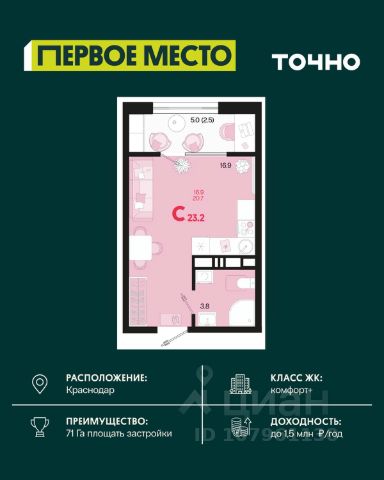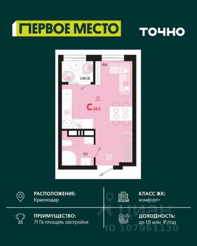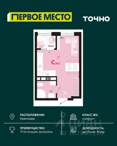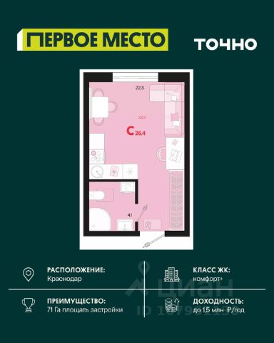 Продается квартира-студия в Жилом комплексе "Родные просторы"! В квартире выполнена качественная предчистовая отделка: Выровненные и подготовленные для отделки финишными материалами стены — улучшенная штукатурка стен. Подготовленный к укладке покрытия пол — стяжка пола. Коммуникации, выведенные в специальных местах в санузлах и кухонной зоне. Металлические входные двери с внутренней фрезеровкой и 2 замками. Металлопластиковые окна с долговечной фурнитурой. Радиаторы со встроенными терморегуляторами. Гидроизоляция пола санузлов. Крутая комплексная застройка территории с развитой инфраструктурой - на территории комплекса расположены школа на 1550 мест, 3 детских сада на 800 мест, поликлиника и частные клиники. На первых этажах домов расположены коммерческие помещения. Дворы свободны от автомобилей. Для автовладельцев предусмотрено более 2000 мест на открытых парковках по периметру микрорайона, и многоуровневые крытые наземные паркинги. Большая часть микрорайона оборудована пешеходными зонами и благоустроенными придомовыми территориями со спортивными площадками и большими детскими игровыми пространствами. Вся инфраструктура района находится в пешей доступности и располагаться внутри микрорайона. Рядом трасса М-4 - удобный выезд в сторону моря! Звоните прямо сейчас и покупайте квартиру в классном жилом комплексе!