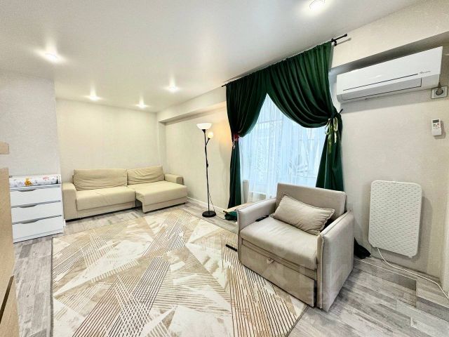 В квартире выполнен новый дизайнерский ремонт. Хорошая планировка с комнатой правильной прямоугольной формы и кухней-гостиной с уже установленным кухонным гарнитуром. Санузел совмещен, установлена новая качественная сантехника. Есть выход на застекленную лоджию.