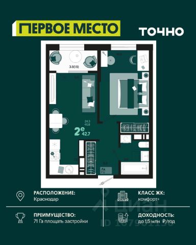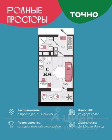 Продается квартира-студия в Жилом комплексе "Родные просторы"! В квартире выполнена качественная предчистовая отделка: Выровненные и подготовленные для отделки финишными материалами стены — улучшенная штукатурка стен. Подготовленный к укладке покрытия пол — стяжка пола. Коммуникации, выведенные в специальных местах в санузлах и кухонной зоне. Металлические входные двери с внутренней фрезеровкой и 2 замками. Металлопластиковые окна с долговечной фурнитурой. Радиаторы со встроенными терморегуляторами. Гидроизоляция пола санузлов. Крутая комплексная застройка территории с развитой инфраструктурой - на территории комплекса расположены школа на 1550 мест, 3 детских сада на 800 мест, поликлиника и частные клиники. На первых этажах домов расположены коммерческие помещения. Дворы свободны от автомобилей. Для автовладельцев предусмотрено более 2000 мест на открытых парковках по периметру микрорайона, и многоуровневые крытые наземные паркинги. Большая часть микрорайона оборудована пешеходными зонами и благоустроенными придомовыми территориями со спортивными площадками и большими детскими игровыми пространствами. Вся инфраструктура района находится в пешей доступности и располагаться внутри микрорайона. Рядом трасса М-4 - удобный выезд в сторону моря! Звоните прямо сейчас и покупайте квартиру в классном жилом комплексе!