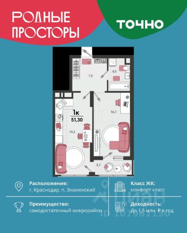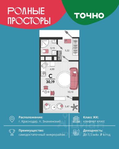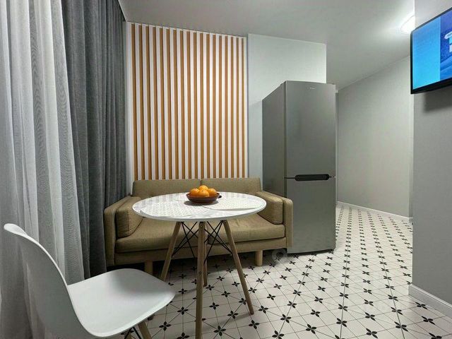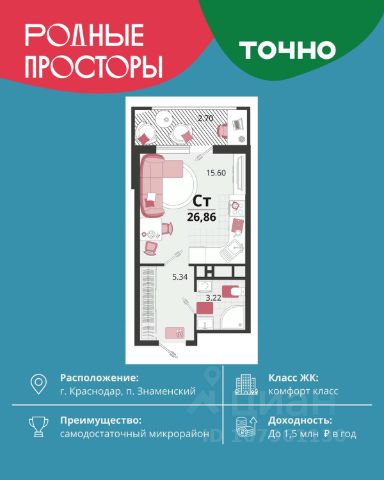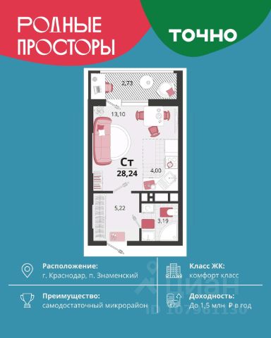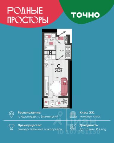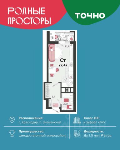 Продается квартира-студия в Жилом комплексе "Родные просторы"! В квартире выполнена качественная предчистовая отделка: Выровненные и подготовленные для отделки финишными материалами стены — улучшенная штукатурка стен. Подготовленный к укладке покрытия пол — стяжка пола. Коммуникации, выведенные в специальных местах в санузлах и кухонной зоне. Металлические входные двери с внутренней фрезеровкой и 2 замками. Металлопластиковые окна с долговечной фурнитурой. Радиаторы со встроенными терморегуляторами. Гидроизоляция пола санузлов. Крутая комплексная застройка территории с развитой инфраструктурой - на территории комплекса расположены школа на 1550 мест, 3 детских сада на 800 мест, поликлиника и частные клиники. На первых этажах домов расположены коммерческие помещения. Дворы свободны от автомобилей. Для автовладельцев предусмотрено более 2000 мест на открытых парковках по периметру микрорайона, и многоуровневые крытые наземные паркинги. Большая часть микрорайона оборудована пешеходными зонами и благоустроенными придомовыми территориями со спортивными площадками и большими детскими игровыми пространствами. Вся инфраструктура района находится в пешей доступности и располагаться внутри микрорайона. Рядом трасса М-4 - удобный выезд в сторону моря! Звоните прямо сейчас и покупайте квартиру в классном жилом комплексе!
