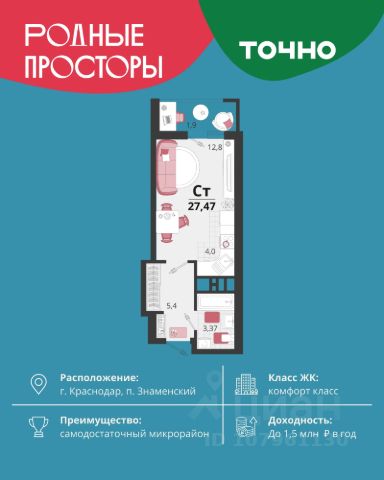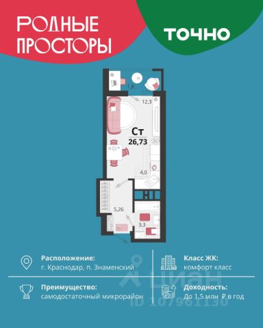Продается квартира-студия в Жилом комплексе "Родные просторы"! В квартире выполнена качественная предчистовая отделка: Выровненные и подготовленные для отделки финишными материалами стены — улучшенная штукатурка стен. Подготовленный к укладке покрытия пол — стяжка пола. Коммуникации, выведенные в специальных местах в санузлах и кухонной зоне. Металлические входные двери с внутренней фрезеровкой и 2 замками. Металлопластиковые окна с долговечной фурнитурой. Радиаторы со встроенными терморегуляторами. Гидроизоляция пола санузлов. Крутая комплексная застройка территории с развитой инфраструктурой - на территории комплекса расположены школа на 1550 мест, 3 детских сада на 800 мест, поликлиника и частные клиники. На первых этажах домов расположены коммерческие помещения. Дворы свободны от автомобилей. Для автовладельцев предусмотрено более 2000 мест на открытых парковках по периметру микрорайона, и многоуровневые крытые наземные паркинги. Большая часть микрорайона оборудована пешеходными зонами и благоустроенными придомовыми территориями со спортивными площадками и большими детскими игровыми пространствами. Вся инфраструктура района находится в пешей доступности и располагаться внутри микрорайона. Рядом трасса М-4 - удобный выезд в сторону моря! Звоните прямо сейчас и покупайте квартиру в классном жилом комплексе!
