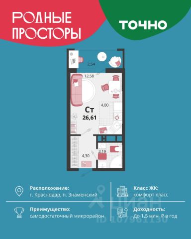 Продается квартира-студия в Жилом комплексе "Родные просторы"! В квартире выполнена качественная предчистовая отделка: Выровненные и подготовленные для отделки финишными материалами стены — улучшенная штукатурка стен. Подготовленный к укладке покрытия пол — стяжка пола. Коммуникации, выведенные в специальных местах в санузлах и кухонной зоне. Металлические входные двери с внутренней фрезеровкой и 2 замками. Металлопластиковые окна с долговечной фурнитурой. Радиаторы со встроенными терморегуляторами. Гидроизоляция пола санузлов. Крутая комплексная застройка территории с развитой инфраструктурой - на территории комплекса расположены школа на 1550 мест, 3 детских сада на 800 мест, поликлиника и частные клиники. На первых этажах домов расположены коммерческие помещения. Дворы свободны от автомобилей. Для автовладельцев предусмотрено более 2000 мест на открытых парковках по периметру микрорайона, и многоуровневые крытые наземные паркинги. Большая часть микрорайона оборудована пешеходными зонами и благоустроенными придомовыми территориями со спортивными площадками и большими детскими игровыми пространствами. Вся инфраструктура района находится в пешей доступности и располагаться внутри микрорайона. Рядом трасса М-4 - удобный выезд в сторону моря! Звоните прямо сейчас и покупайте квартиру в классном жилом комплексе!