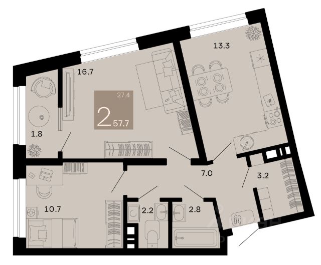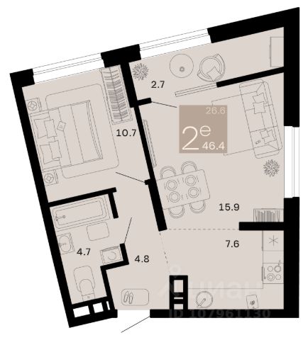 -Просторная квартира свободной планировки, с двумя световыми точками, что без труда позволит вам выделить зону кухни и спального пространства по вашему вкусу!