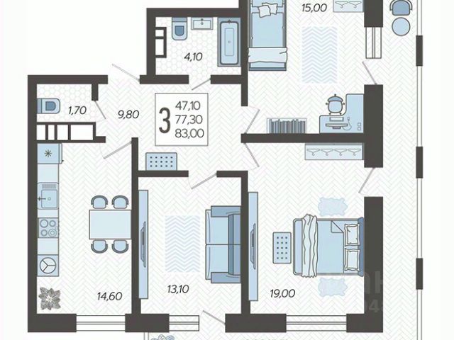 Семейная планировка: 3 изолированные комнаты + кухня-гостиная 14 м²