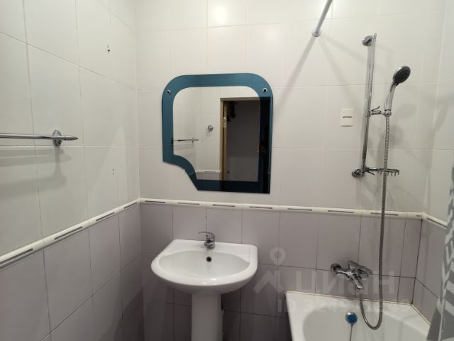 В санузле широкоформатная плитка, зеркало, подвесной унитаз, электрический полотенцесушитель, стиральная машина, проточный водонагреватель, бесшумный вентилятор.