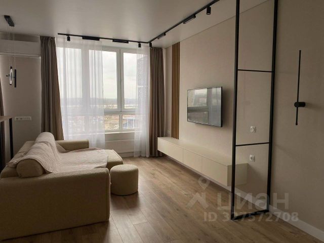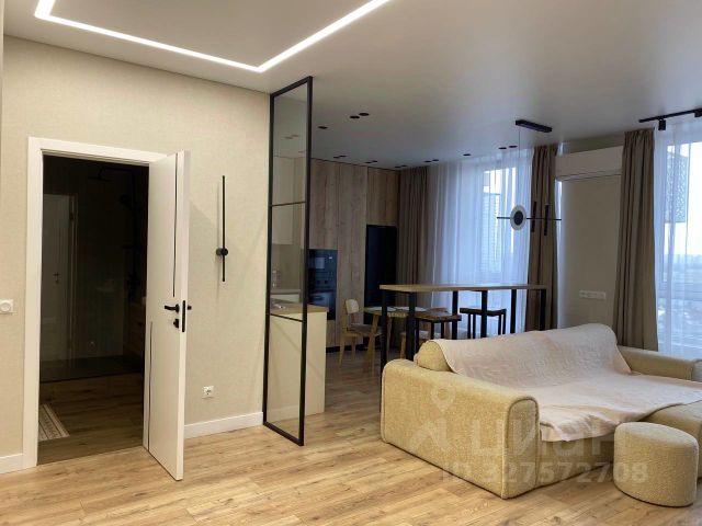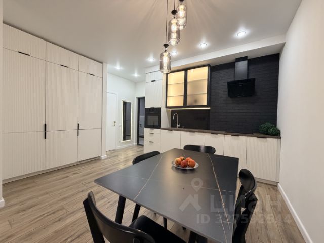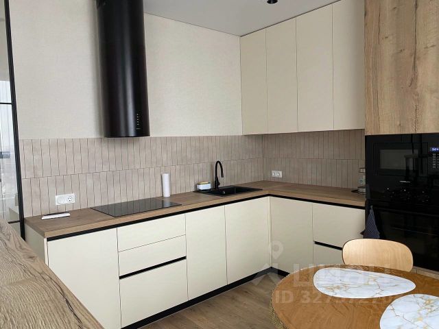 Угловая кухня выполнена под заказ, однотонные фасады шкафов AGT и под дерево EGGER , посудомоечная машина, холодильник, варочная поверхность, духовой шкаф, микроволновая печь. Столовая зона с круглым столом,стульями из натурального дерева. В комнате установлена сплит система Kentatsu (на площадь 35 кв.м). Большой угловой диван (260 см длинной) и подвесная ТВ консоль 260 см.