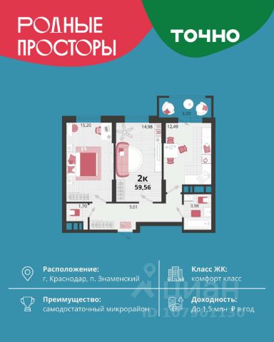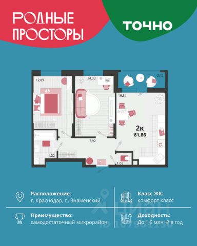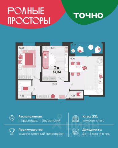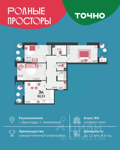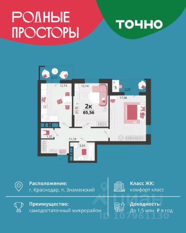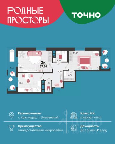 Продается квартира-студия в Жилом комплексе "Родные просторы"! В квартире выполнена качественная предчистовая отделка: Выровненные и подготовленные для отделки финишными материалами стены — улучшенная штукатурка стен. Подготовленный к укладке покрытия пол — стяжка пола. Коммуникации, выведенные в специальных местах в санузлах и кухонной зоне. Металлические входные двери с внутренней фрезеровкой и 2 замками. Металлопластиковые окна с долговечной фурнитурой. Радиаторы со встроенными терморегуляторами. Гидроизоляция пола санузлов. Крутая комплексная застройка территории с развитой инфраструктурой - на территории комплекса расположены школа на 1550 мест, 3 детских сада на 800 мест, поликлиника и частные клиники. На первых этажах домов расположены коммерческие помещения. Дворы свободны от автомобилей. Для автовладельцев предусмотрено более 2000 мест на открытых парковках по периметру микрорайона, и многоуровневые крытые наземные паркинги. Большая часть микрорайона оборудована пешеходными зонами и благоустроенными придомовыми территориями со спортивными площадками и большими детскими игровыми пространствами. Вся инфраструктура района находится в пешей доступности и располагаться внутри микрорайона. Рядом трасса М-4 - удобный выезд в сторону моря! Звоните прямо сейчас и покупайте квартиру в классном жилом комплексе!