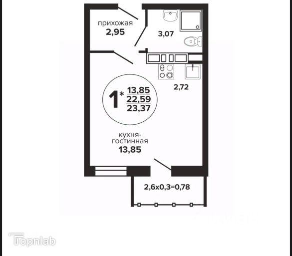 Площадь: 23 кв.м, функциональная студия с продуманной планировкой.