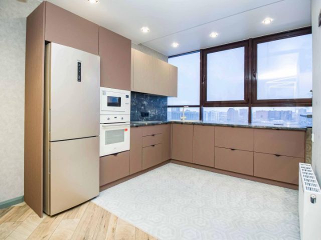 Вся мебель выполнена на заказ, фасады крашеные, эмаль, все механизмы на мебели австрийские Blum.