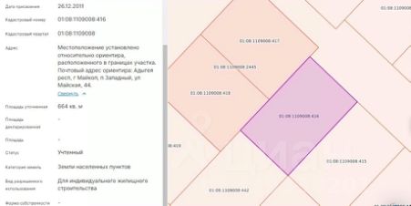 Земельный участок с кадастровым номером 01:08:1109008:416, площадью 664 кв.м по адресу: Местоположение установлено относительно ориентира, расположенного в границах участка. Почтовый адрес ориентира: Адыгея респ, г Майкоп, п Зап...