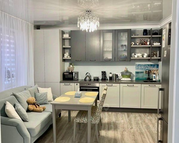 В кухне-столовой — кухонный гарнитур со встроенной бытовой техникой, обеденный стол.