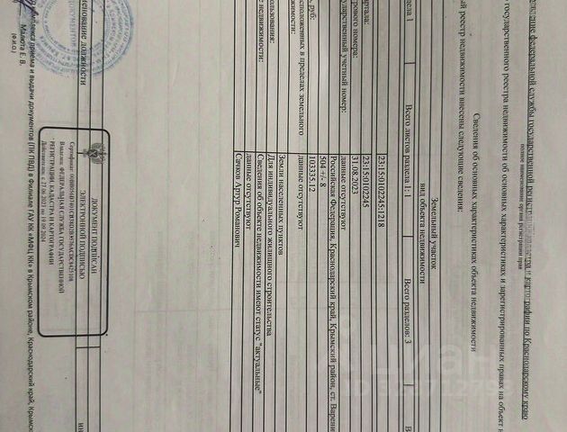 Земельный участок в центре, подъезд к участку асфальтированный, в шаговой доступности магазины, почта, аптека, администрация, по участку проходит центральный водопровод, проходит центральная газовая труба, и электрический столб, 14 км от Азовского моря, рыбалка и охота. Кадастровый номер: 23:27:0209004:10006.