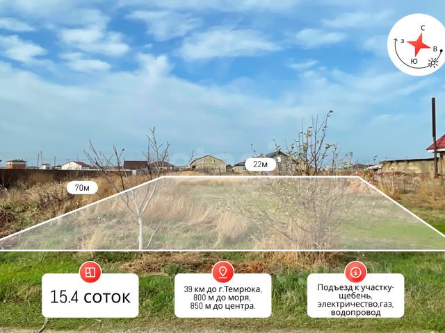 Участок расположен в районе, который густо застроен частными домами. В 2 минутах проходит дорога ведущая в центр поселка, развилки на Краснодар, Анапу и Крым, что обеспечивает хорошую транспортную доступность, в дали звуков проезжающих машин.