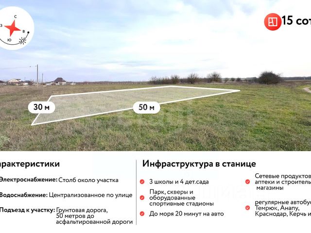Земельный участок площадью15 соток расположен в станице Старотитаровской, в благоустроенном жилом массиве с развитой инфраструктурой. Участок имеет правильную форму с фасадом 30 метров и длиной 50 метр, что оптимально для строительства частного дома. Вид разрешенного использования — ведение личного подсобного хозяйства (приусадебный участок), что позволяет возвести жилое строение без нарушения норм застройки Старотитаровского сельского поселения.