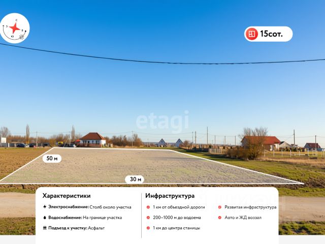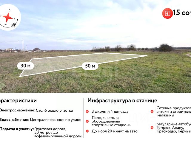 Продается земельный участок в станице Старотитаровской Темрюкского района Площадь участка 15 соток. Назначение земли - ЛПХ. Участок угловой: фасады 30 и 50 метров. Участок ровный, без построек. Электричество, газ и центральная вода по улице. Станица Старотитаровская - самая большая станица в Темрюкском районе. В станице 3 общеобразовательные школы (1-11 классов), 4 детских сада, физкультурно-оздоровительный комплекс с большим количеством спортивных секций, Детско-юношеская школа искусств, станция юных техников и многое другое для развития ваших детей. Так же здесь множество продуктовых и хозяйственных магазинов, есть сетевые "Пятерочка", "Магнит", "Красное и белое"; аптеки "Фитофарм", "Апрель" и другие; Частные пекарни; Рынки фермерских продуктов, овощей и фруктов; Строительные магазины, множественные ПВЗ "Озон", "Wildberries", "Яндекс-Маркет", "СДЭК", и многое другое, что делает жизнь в станице комфортной. Отличная транспортная доступность. Из станицы легко добраться до городов Темрюк, Анапа, Керчь, Краснодар и других населенных пунктов на общественном транспорте - маршрутном такси, рейсовых автобусах и электричке. У земельного участка один собственник. Документы готовы к выходу на сделку! Звоните!. Дополнительно оплачивается комиссия с покупателя. Код пользователя: 187293 Номер в базе: 10406367
