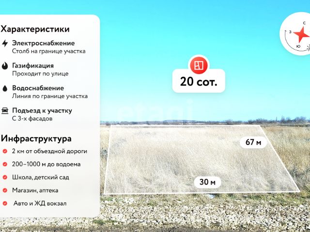 Продается земельный участок 20 соток. Правильной, прямоугольной формы с фасадом 30 метров. Можно построить дом, а часть участка продать и вернуть часть затрат. Участок расположен а хуторе Белом, расположенном между Анапой и Темрюком. Мимо проходит новая федеральная трасса на Крым. Поселок с развитой инфраструктурой, есть детский сад, школа, продуктовые и хозяйственные магазины, остановки общественного транспорта. Хутор расположен на возвышенности, что исключает подтопление в дождливый период. ID объекта: 690060 Отличный участок 20 соток.