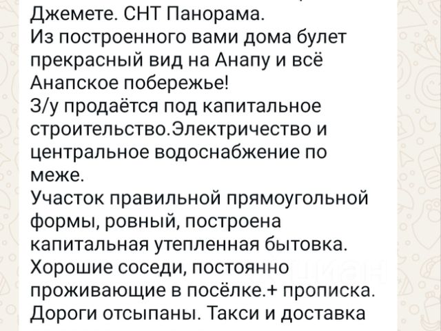 Земельный участок с видом на море и Анапу СМОТРИТЕ ВИДЕООБЗОР - ПРИВЯЗАН К ОБЪЯВЛЕНИЮ Кадастровый номера на выбор: 23:37:0716001:1470 Видовой земельный участок 5 сот. в х.Красном, ближайшем пригороде Анапы, эксклюзивное предложение. Назначение - ИЖС, земли населенных пунктов. До Анапы 2,5 км До Пионерского проспекта и знаменитых анапских песчаных пляжей 3 км Потрясающий вид с участка открывается на город, коттеджные поселки Загород -1 и Загород -2, а главное МОРЕ. Коммуникации: По границе участка проходит электричество, останется подключить только на участок (15 кВт), возможность подключения к центральному водоснабжению (вопрос по центр. воде решается) и газу. Фасад 20 м, участок сухой, подтоплений нет. Земля- чернозем. Арт. 124453128