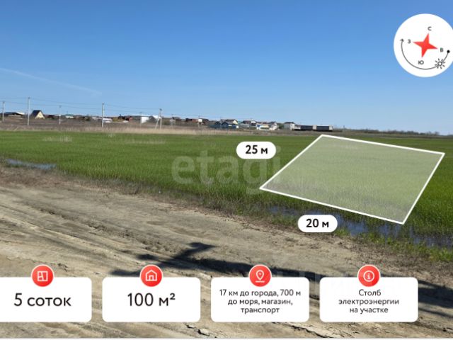 Продается земельный участок 5 соток в станице Голубицкая на побережье Азовского моря. Ровный участок с удобными пропорциями: фасад 20 метров, общий периметр 92 метра. Земля предназначена для индивидуального жилищного строительства (ИЖС). Всего в 700 метрах от вашего участка начинаются песчаные пляжи и морской воздух. В шаговой доступности — вся необходимая инфраструктура: магазины, рынок, кафе и детский сад. Участок подходит для постоянного проживания или коммерческого проекта. Все центральные коммуникации проходят рядом с границами территории. . Дополнительно оплачивается комиссия с покупателя. Код пользователя: 203039 Номер в базе: 12284629