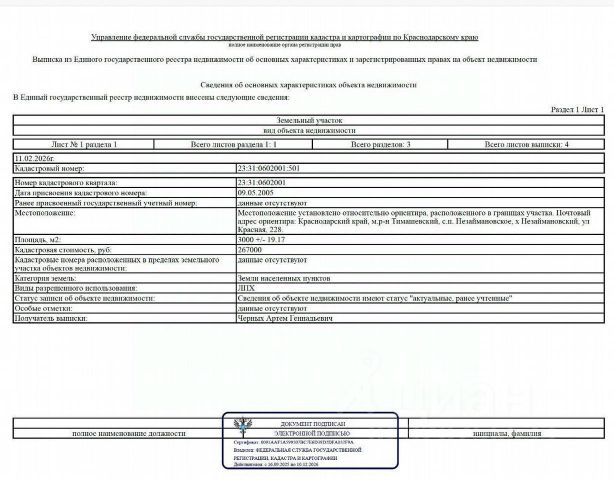 Продаю земельный идеально ровный и чистый участок. Площадью 1500 кв. М, для постройки частного жилого дома с возможностью Прописки, вся необходимая инфроструктура магазины школа садик имеется. Кадастровый номер участка 23:05:0302057:115. Перед участком до дороги имеется Огромная придомовая территория 35 метров длинной. Рядом трасса М4 где ходит общественный транспорт во все концы Краснодарского края. Всего 15 минут до Выселковской, и час до Краснодара на машине! Категория земель — земли населенных пунктов. Сетевой, свет, газ, рядом с участком. Подходит под сельскую ипотеку до 3% годовых на строительство дома на данном участке! Имеется разрешение на строительство индивидуального жилого дома сроком действия 10 лет! Просмотр возможен в любой день. Собственник. Не подошёл этот участок, выбрали другой — не беда, помогу проверить его на ликвидность, запреты, ограничения, на банкротство продавца, подскажу, что в соответствии с градпланом можно строить на выбранном участке, и подходит ли он вообще для какого-либо строительства, так как может быть: по выписке из Егрн там земли населённых пунктов под Ижс, а по Гпзу там земли лесного фонда, или под участком или рядом проходит газопровод или нефтепровод высокого давления — и всё, участок становится неликвидным, а деньги выброшены на ветер, так как любое строительство на таком участке будет запрещено, либо если продавец находится в банкротном или предбанкротном состоянии, то участок вскоре будет возвращён в конкурсную массу, а деньги за него Вам никто не вернёт! Также помогу приобрести другой дом или участок в любой точке страны по Вашим параметрам с любых электронных торгов (по банкротству, арестованного имущества, муниципальных) с дисконтом 30, 50, 100% от рыночной стоимости как для собственных нужд, так и с целью выгодного инвестирования — вложения денег в ликвидную недвижимость! Приобретение с торгов гораздо надежнее чем покупка у собственника так как утверждается решением Арбитражного суда! Помимо этого помогу в юридическом сопровождении сделки купли-продажи, посоветую, какие условия внести в договор купли-продажи недвижимости, чтобы максимально обезопасить Вас от возможных будущих неприятностей! Не Риэлтор!