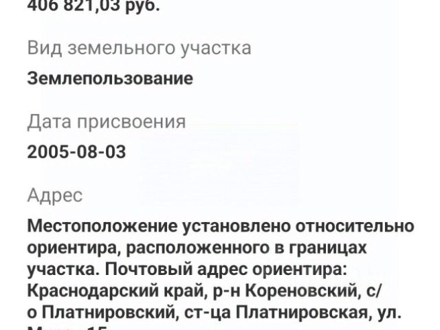 Продаю земельный участок 7,31 соток в Краснодарском крае г. Кореновск по ул. Победы, д. 59 с газом, с электричеством, колодец на участке, установлен в колодец счетчик прибора учета холодной воды в 2023 году. На участке стоит саманный дом 26,6 м2 пригодный для временного проживания с проведенным газом и холодной водой. Границы по межеванию установлены. Участок сухой, ровный. На участке есть плодовитые деревья: Груша "Вильямс", Орешник, Алыча. В пешей доступности магазины, рынок, автобусные остановки, ж/д станция 890м. Рядом благополучные соседи. Прямой собственник. Перекупщиков прошу не беспокоить, обмен не интересен.