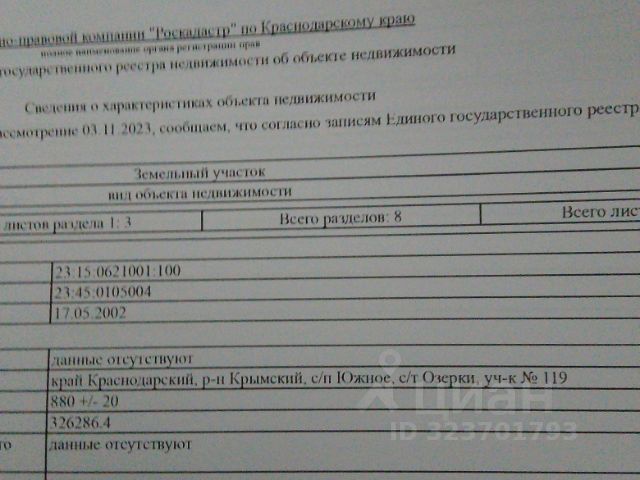 Лот 3941 Продаётся участок в микрорайоне Озерки. Площадь -778 кв. м. , правильной формы с ровным рельефом ,оформлен в собственность, отмежеван. Кадастровый номер:23:15:0621001:123 Коммуникации проходят по меже. участок 143 и есть участок 266 Больше предложений смотрите в магазине и на сайте "ЭВРИКА-КРЫМСК"