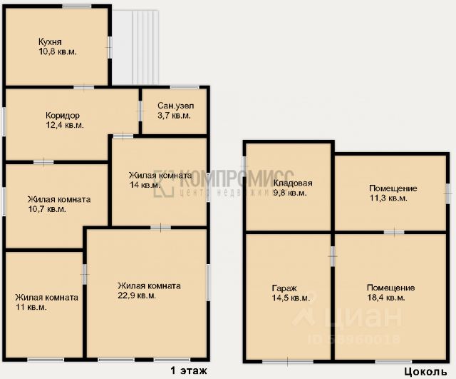 Площадь дома 79,8 кв. м. В отдельном здании кухня, сан. узел, гараж 55 кв.м. (см. план)