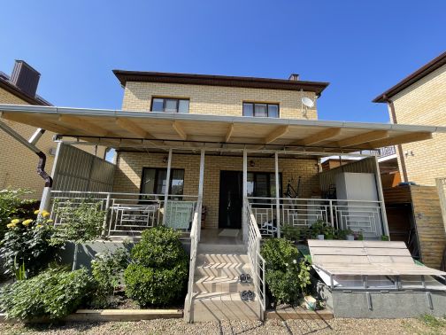 Во дворе просторная терраса с садовой мебелью (ротанг). Территория участка ухоженная, с красивым озеленением.