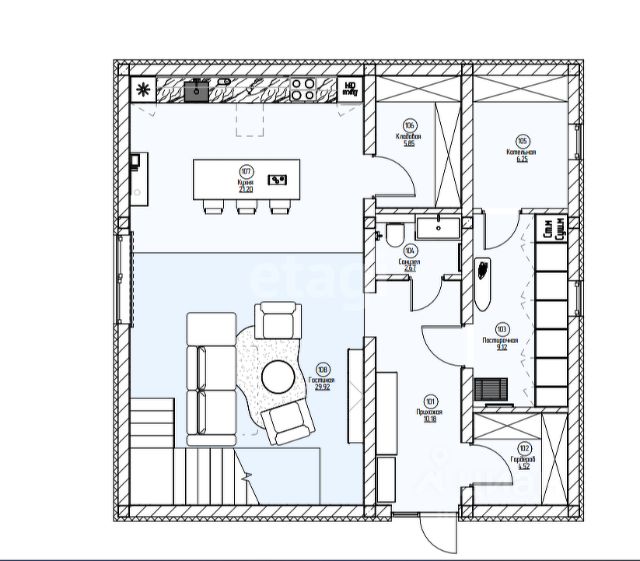 Общая площадь дома 54,6 кв. м., без учета мансардного этажа.