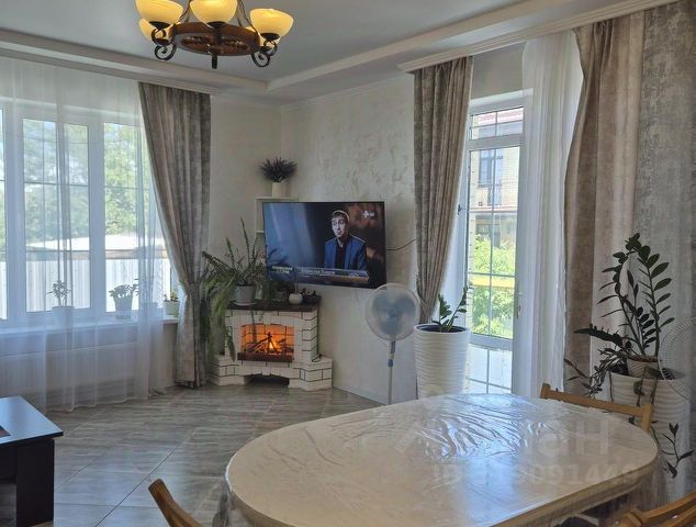 просторная кухня-гостиная, где кулинарные шедевры рождаются под аккомпанемент потрескивающего в камине огня. Кухонный гарнитур с современной техникой и обеденный стол создают идеальное пространство для семейных трапез и дружеских посиделок.