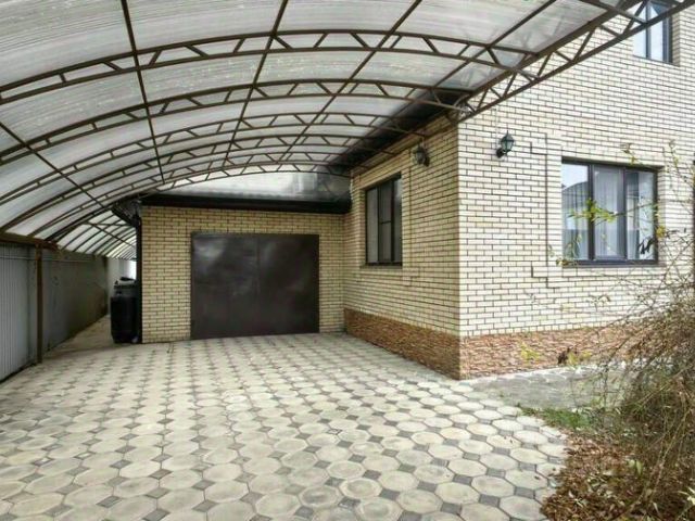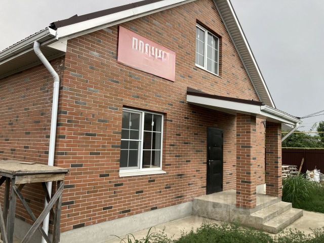 Дом возведен полностью из кирпича, высокий цоколь, металлопастиковые окна, кровля — металлочерепица, большая застекленная лоджия-веранда.
