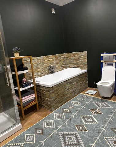 В доме выполнен ремонт: санузел отделан керамической плиткой, установлена сантехника, межкомнатные двери, стены — обои, ламинат и керамическая плитка — на полу, теплые полы, натяжные потолки, отделка лестницы на второй этаж.