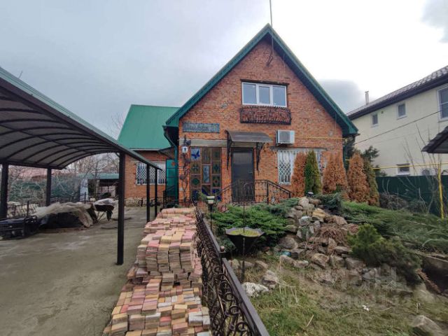 Облицован керамическим кирпичом. С кухни есть выход на крытую террасу. Есть зона под котельную в доме.Из коммуникаций в доме есть : свет 15 кв, газ проходит по меже , свет.