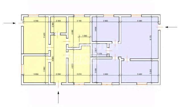Одноэтажной коттедж общей площадью 75 кв.м современной планировки: прихожая, холл 8,6 кв.м, три изолированные спальни 10 кв.м, 11,5 кв.м, 12,3 кв.м, совмещенный санузел 5,1 кв.м, кухня-гостиная 24 кв.м.