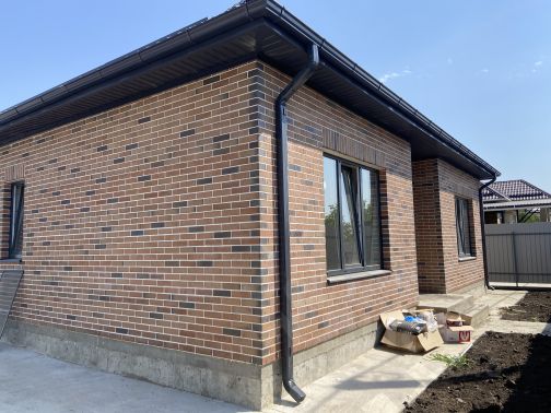Коттедж возведен в современном архитектурном стиле Райта, полностью из кирпича, внутренние стены — забутовочный кирпич, наружные — керамический кирпич, большие металлопластиковые окна с внешней ламинацией, кровля — металлочерепица, входная группа с навесом, крытая терраса, балкон.