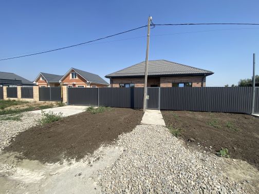 Участок огорожен по периметру забором, фасадный — кирпичные колонны, ворота откатные, калитка.