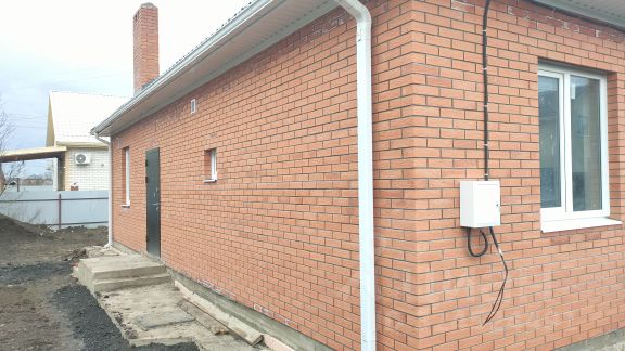 Одноэтажный коттедж возведен на свайно-ростверковом фундаменте, материал стен — газоблок, наружные — облицовочный кирпич, металлопластиковые окна, кровля — металлочерепица.