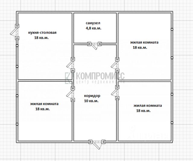 В доме- три изолированные жилые комнаты, кухня (18 кв.м.), просторный санузел (4,8 кв.м.) и коридор.