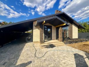 Одноэтажный коттедж возведен в архитектурном стиле шале, на ленточном фундаменте, материал стен — газоблок 250 мм, наружные — облицовочный керамический комбинированный кирпич, кровля — металлочерепица, большие энергосберегающие двухкамepныe oкна, кухня-гостиная — со вторым светом и окнами в пол.