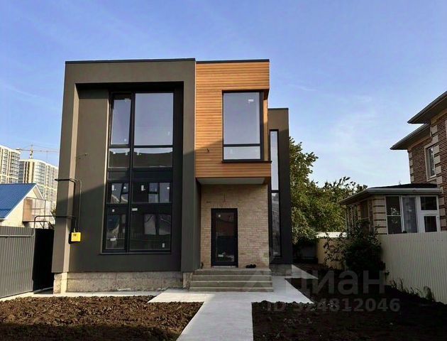 В ПРОДАЖЕ! Новый коттедж в стиле хай-тек в микрорайоне Губернский, район Любимово. Жилой массив представлен исключительно домами и коттеджами, никакой высотной застройки нет на улицах нет, и при этом в пешей доступности — вся необходимая социальная и коммерческая инфраструктура. Престижный, тихий, благоустроенный район, где комфортно живется в собственном доме. Широкие улицы, хорошие дороги, много деревьев, уличное освещение. Двухэтажный коттедж возведен в современном архитектурном стиле хайтек с использованием качественных строительных материалов: ленточный фундамент, стены — забутовочный кирпич, облицован фасадной штукатуркой и кирпичом ручной формовки, в отделке фасада использовалась также лиственница. Панорамные металлопластиковые энергосберегающие окна создает в доме много света, плоская кровля, качественные, не требующие замены входные двери. Дом — в предистовой отделке: стяжка, штукатурка, теплый пол по всему первому этажу и на втором — в санузле, современные радиаторы отопления, разводка электрического, сантехнического и отопительного оборудования, газовый котел. Дом общей площадью 165 кв.м + крытая терраса эргономичной планировки: крыльцо, прихожая, холл, гардеробная, изолированная комната, совмещенный санузел, котельная, кухня-гостиная с выходом на террасу и задний двор. Второй этаж — холл, три изолированные комнаты, санузел. Все коммуникации заведены и подключены: газ, свет 15 кВт, вода — скважина, канализация — септик. Участок 5 соток, назначения ИЖС, огорожен по периметру забором, калитка, автоматические роллетные ворота. Двор забетонирован, парковочные места. На участке можно разбить ландшафтный дизайн, палисадник, обустроить зону барбекю. Вся необходимая инфраструктура — в реальной пешей доступности: магазины, поликлиника, три школы, детские сады, остановка общественного транспорта, прогулочная аллеяю Дом готов.