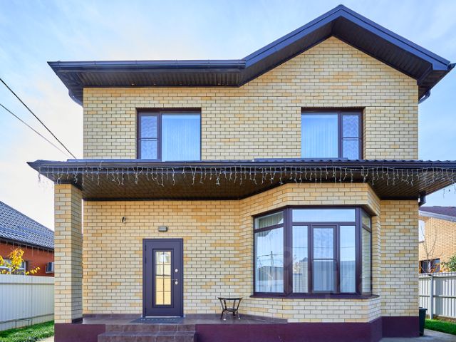 Двухэтажный коттедж возведен в современном архитектурном стиле хайтек с использованием качественных строительных материалов: ленточный фундамент, стены — забутовочный кирпич, облицован фасадной штукатуркой и кирпичом ручной формовки, в отделке фасада использовалась также лиственница.