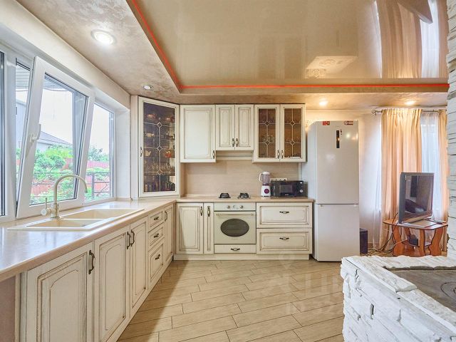 На первом этаже расположен кабинет, кухня с камином, столовая, комната отдыха, гостевой с/у, котельная. Особое внимание уделено помещениям для хранения, которые вписываются не как бытовые комнаты, а помещения с продуманным интерьером, удобством и дизайнерскими решениями. При планировке дома, учитывались не общепринятые принципы расположения, а максимальный комфорт, удобства в быту. Результат - уют, чистота (вещи всегда на своем месте), отсутствие ощущения громоздкости дома, логическое расположение всех предметов и вещей. Куда бы вы не зашли, будь то спальная комната или погреб или гардеробная или кухня или с/у, вы будете находится в комфорте и уюте.