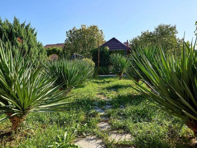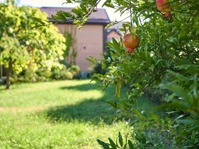 - Ухоженный газон и плодовые деревья на участке и за его пределами.