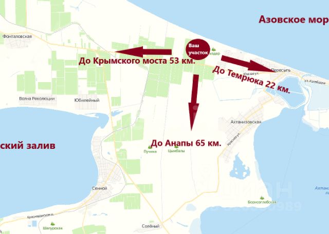 До Крымского моста 60 км, до Темрюка 22 км, до Аэропорта "Витязево" 60 км.