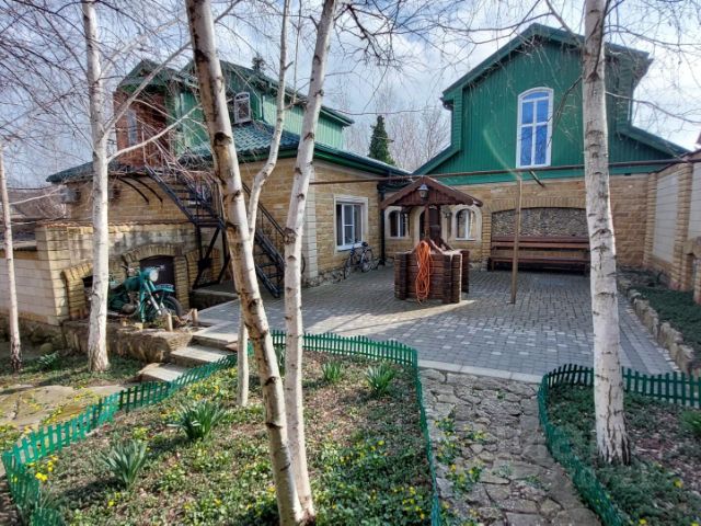 Двор выложен плиткой и белым дагестанским камнем. Во дворе имеется туалет, летняя просторная беседка с камином для жарки шашлыков, настоящая баня, дровник с внушительным запасом дров, несколько подсобных помещений. В цокольной части дома имеется гараж, вход со двора.